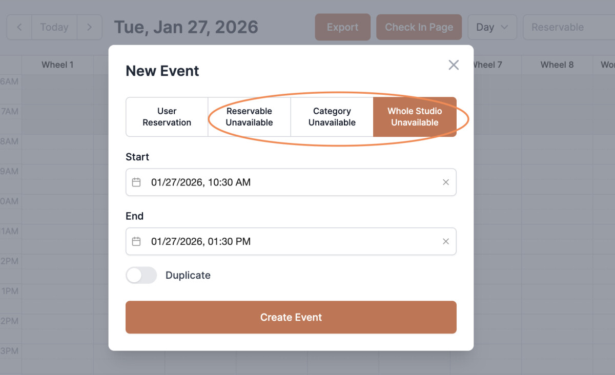 - Whole Studio Unavailable: This blocks off entire studio from being available for reservations