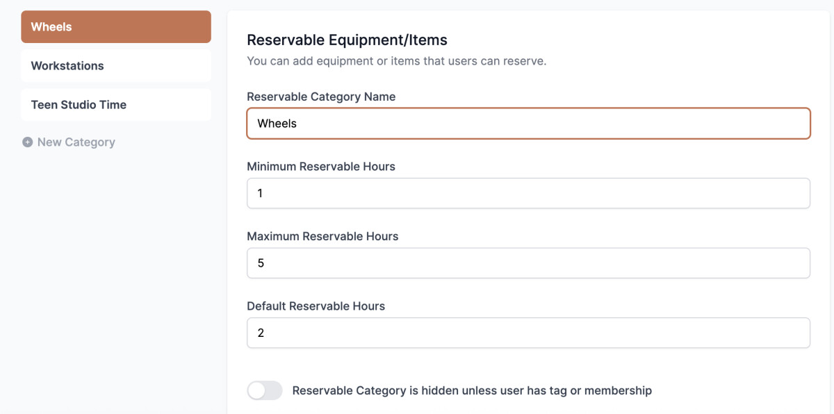 Reservable Category is hidden unless user has tag or membership: This has to do with the kind of user perks you decide or build in for members or certain kinds of students.